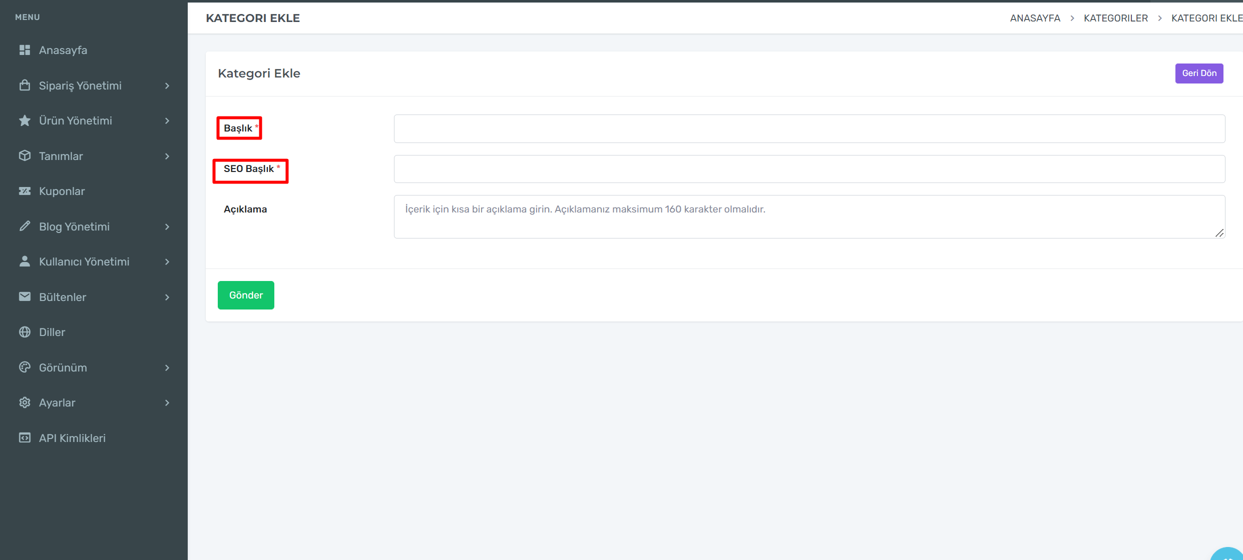 Kırmızı ile işaretlenmiş alanları doldurarak kategorinizi eklemiş olursunuz.