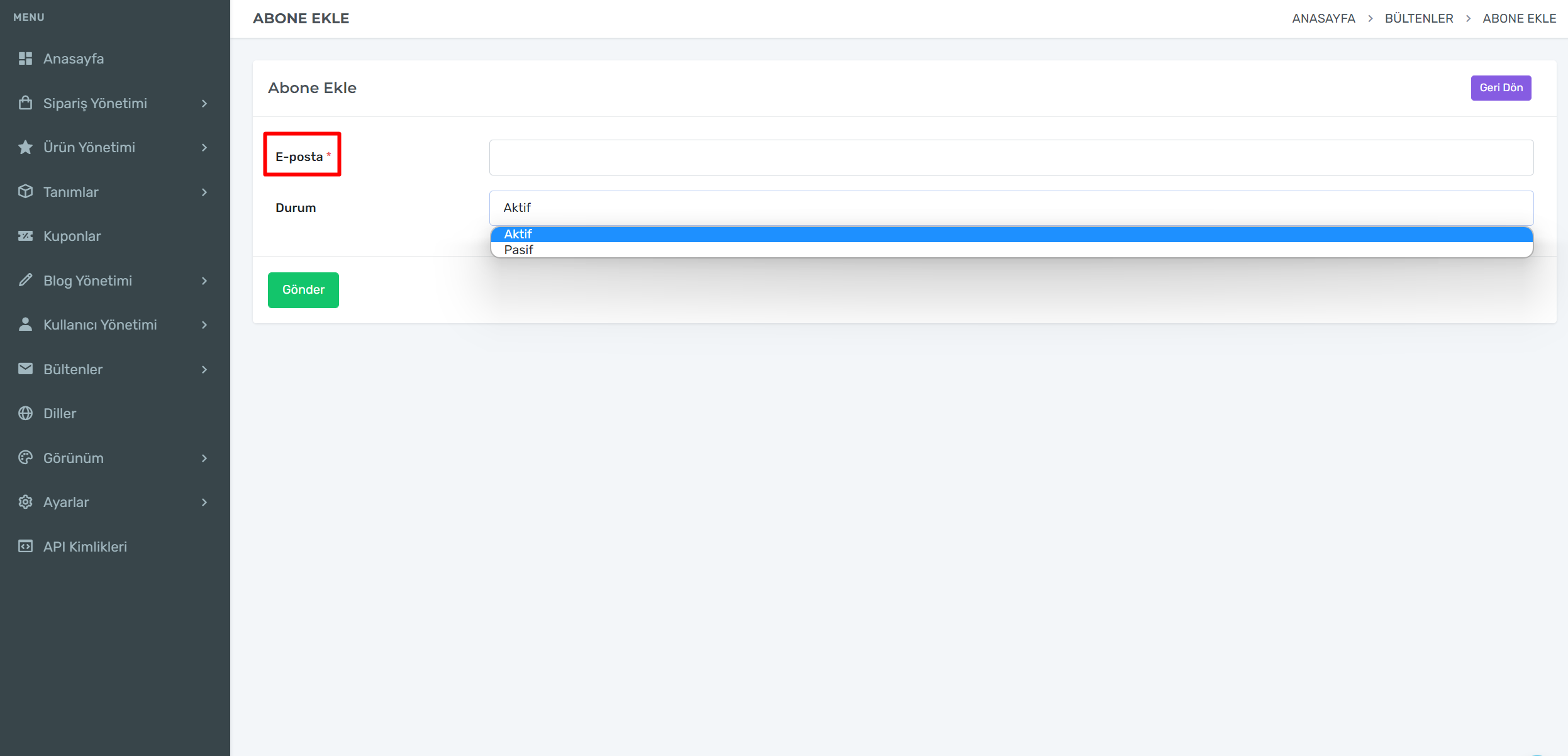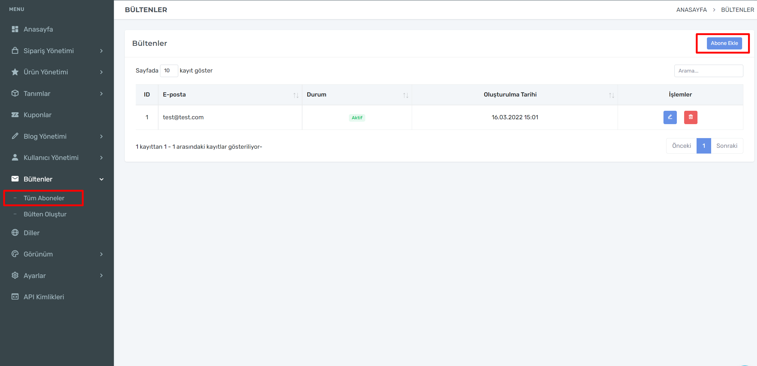 Abone ekle sekmesinden e-posta adresi girerek abone oluşturabilirsiniz.