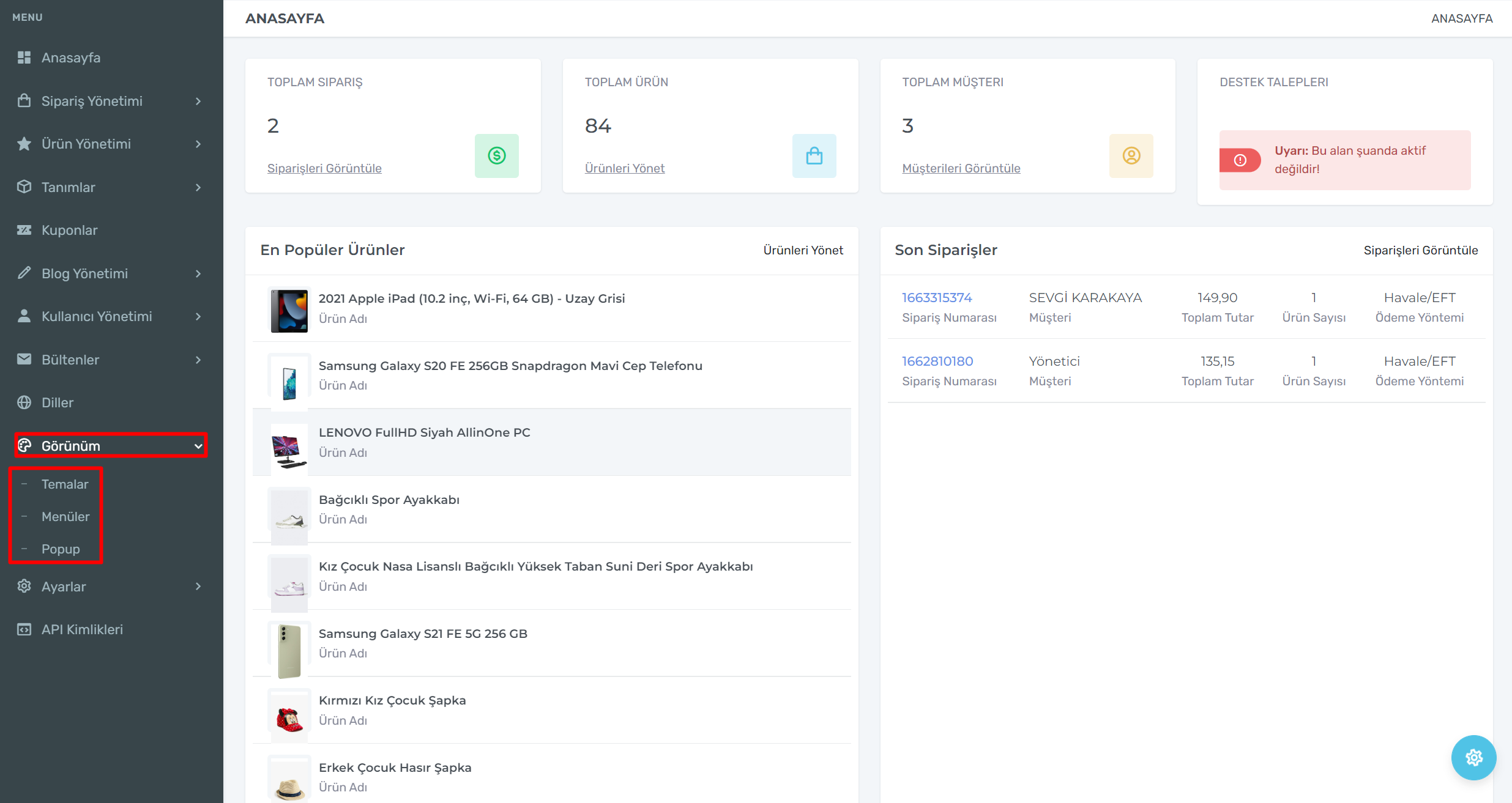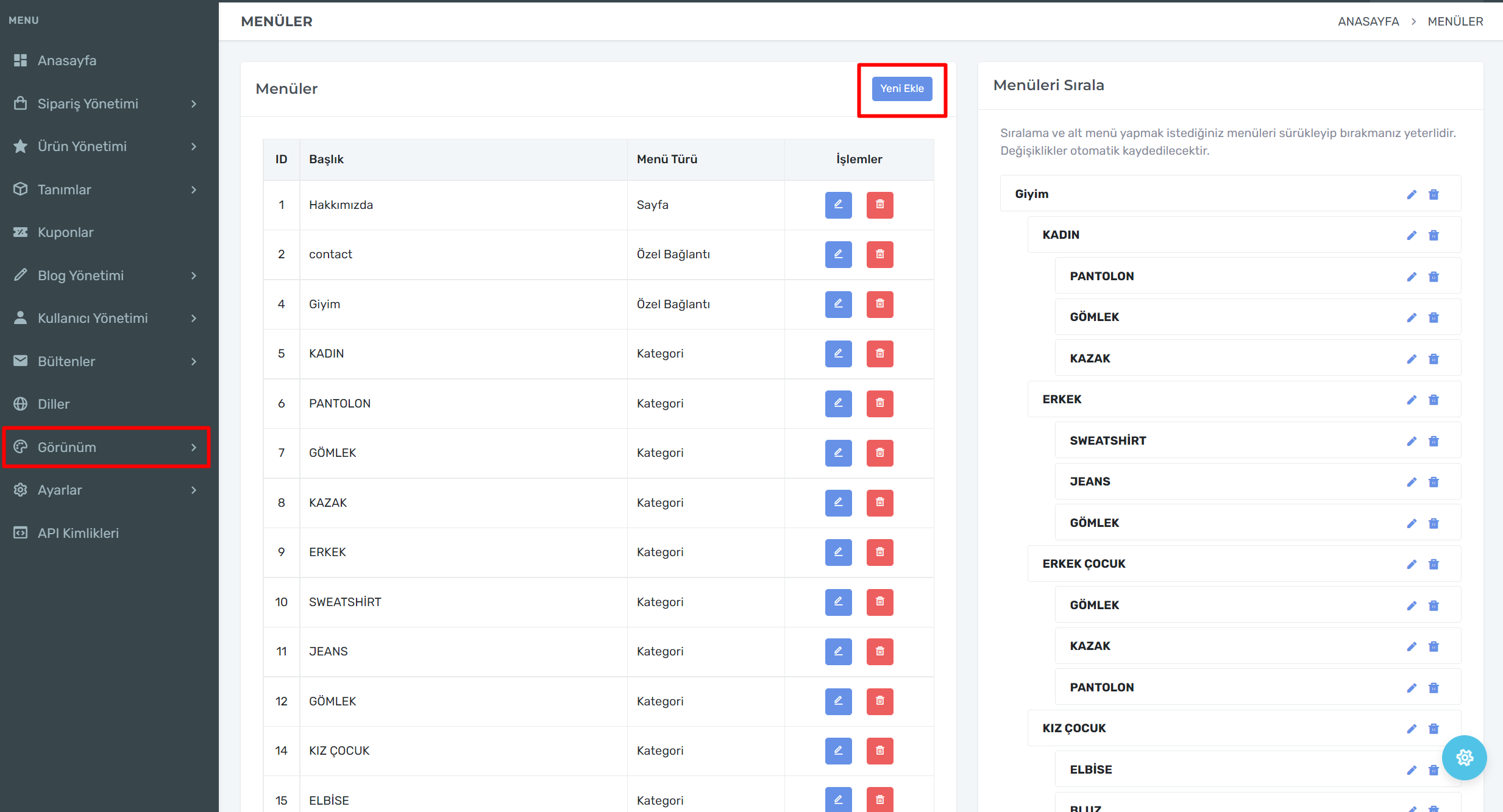 Menüler sekmesinden e-ticaret sitenize eklediğiniz ürünleri sıralayabilirsiniz.