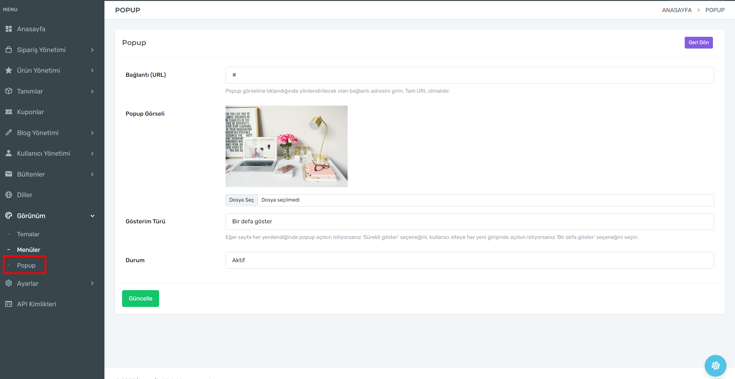 Öne çıkarmak istediğiniz bir kampanya tanıtım metni oluşturarak web siteniz açıldığı anda gözükmesini sağlayabilirsiniz.