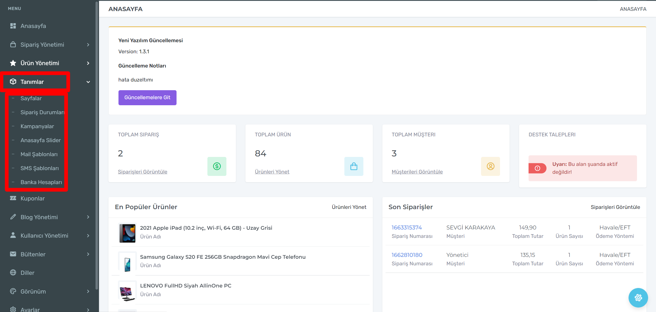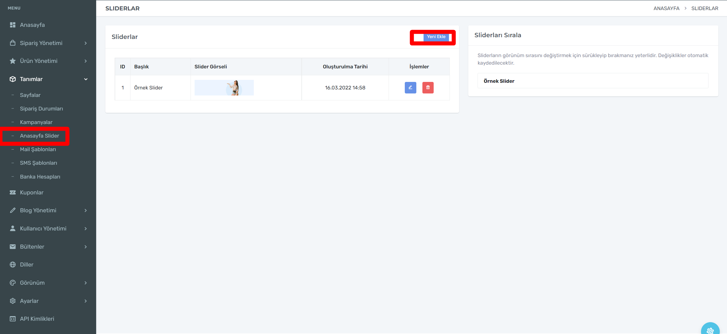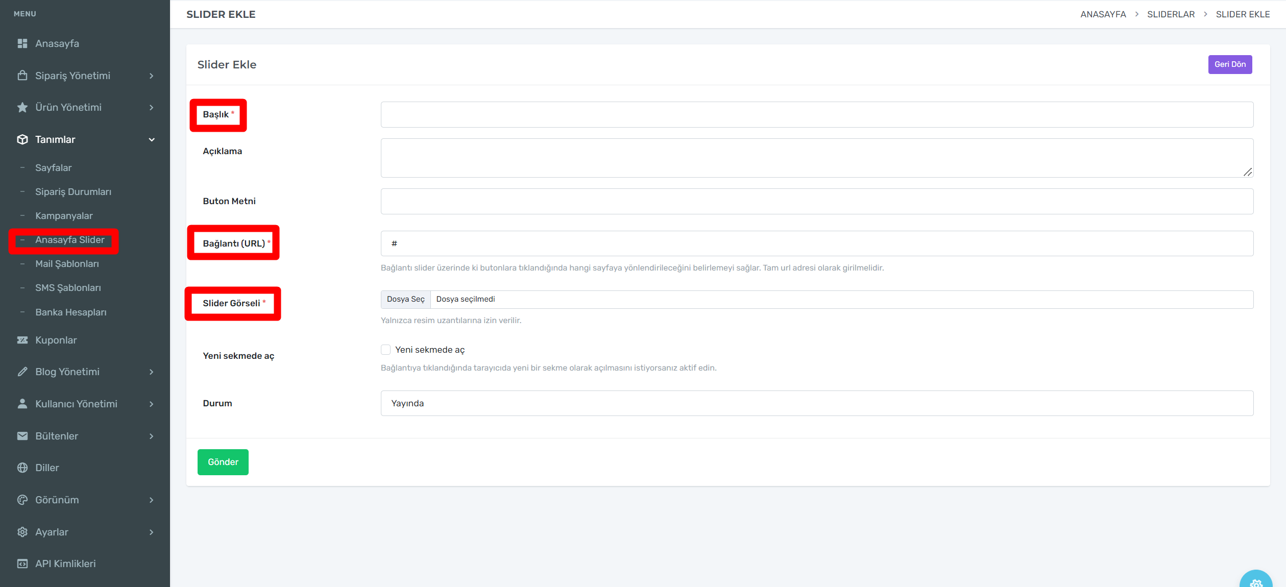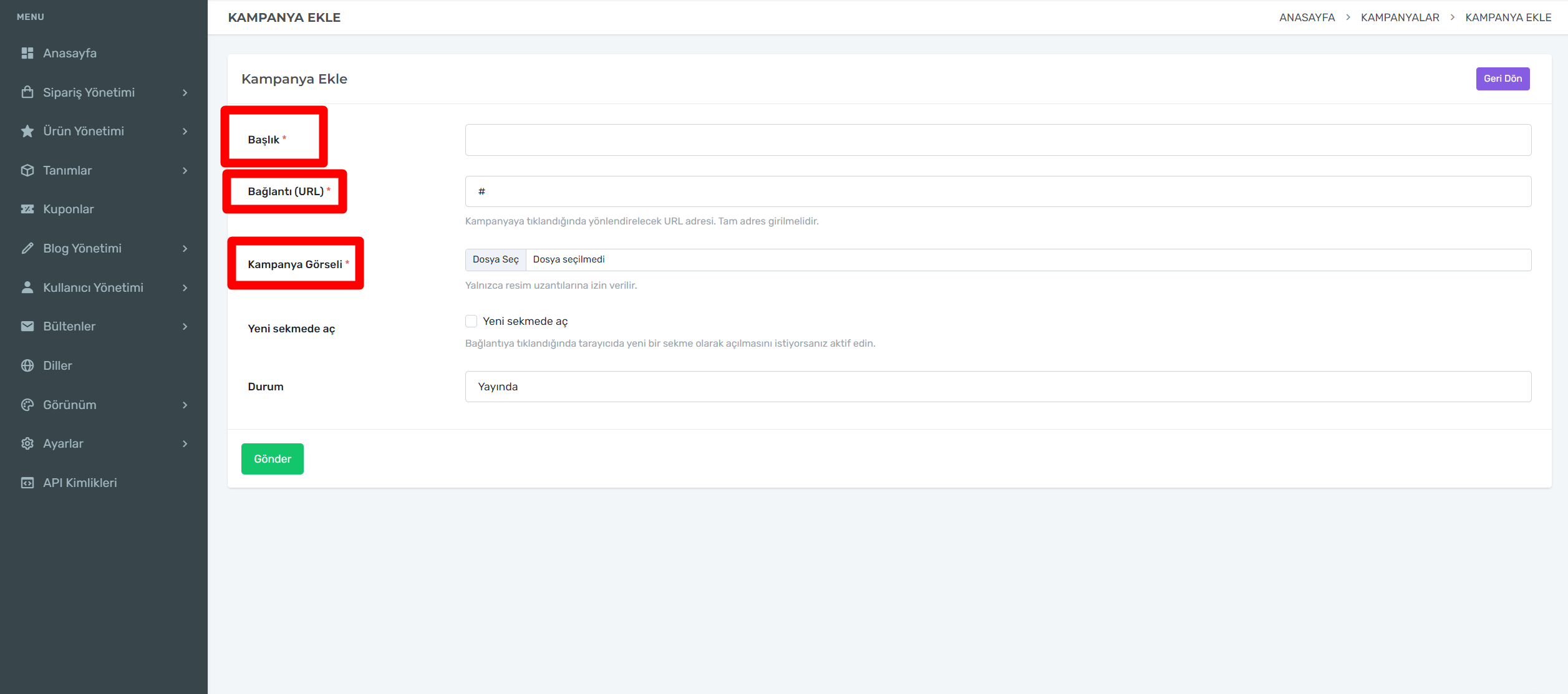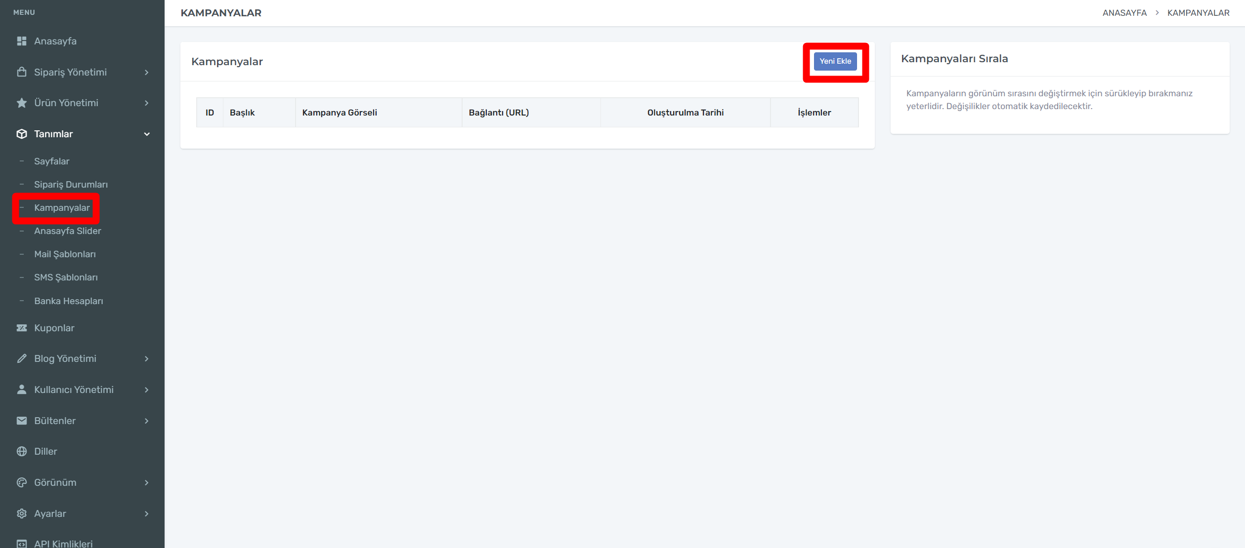 E-Ticaret sitenizde bir kampanya duyurmak istiyor iseniz Tanımlar-Kampanyalar adımını takşp etmeniz yeterli olacaktır.Kampanyalar yeni ekle kutucuğuna tıklayıp 2. görselde ki alanları doldurarak kampanyanızı yayınlayabilirsiniz.