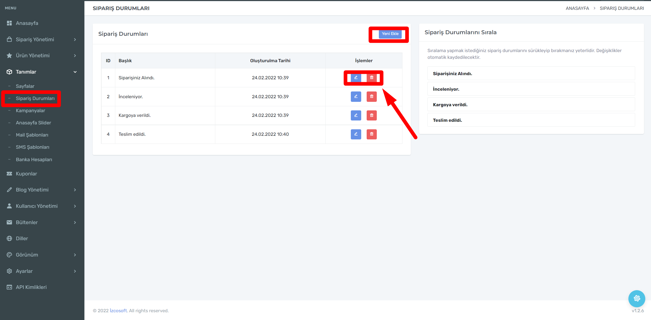 Ürünlerinizin durumlarını müşterilerinizin görmesi takip edebilmesi için durum oluşturmalısınız.Resimde gördüğünüz ok işaretinin gösterdiği alan da mavi kutucuk ile düzenleyebilir kırmızı kutucuk ile de oluşturduğunuz durumu silebilirsiniz.