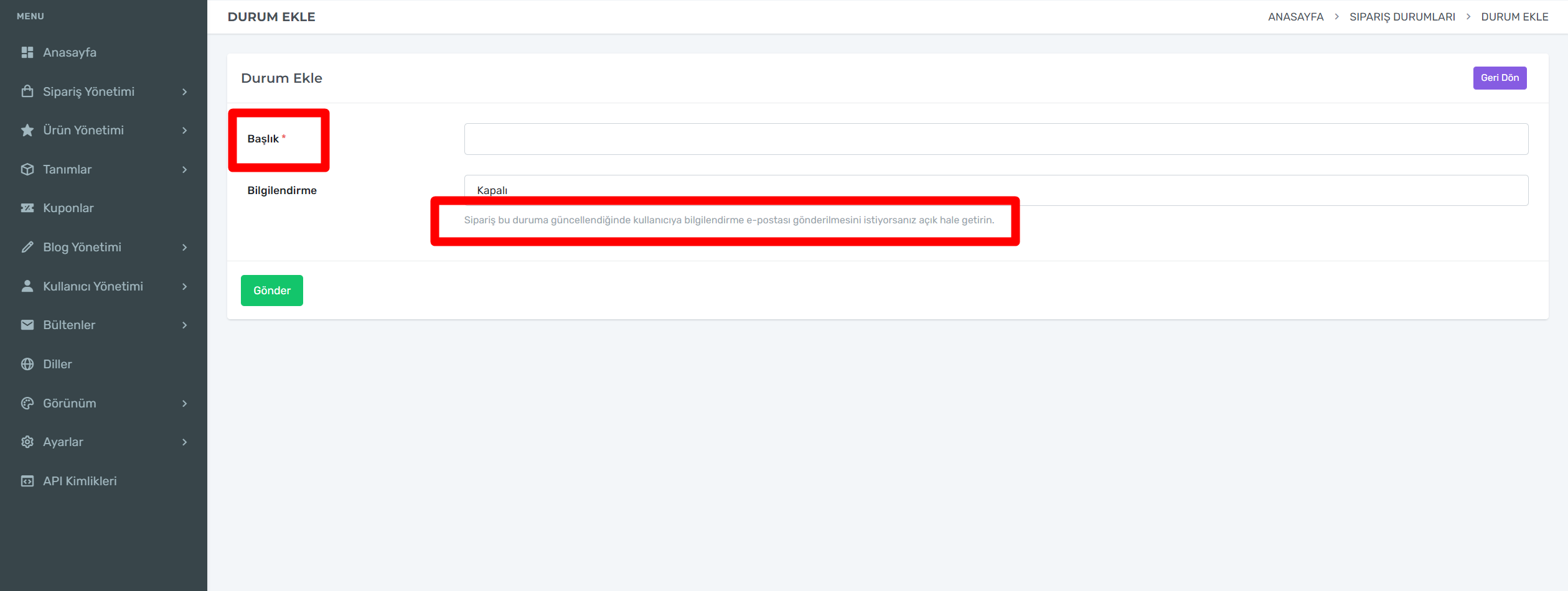 Sipariş bu duruma güncellendiğinde kullanıcıya bilgilendirme e-postası gönderilmesini istiyorsanız açık hale getirin.