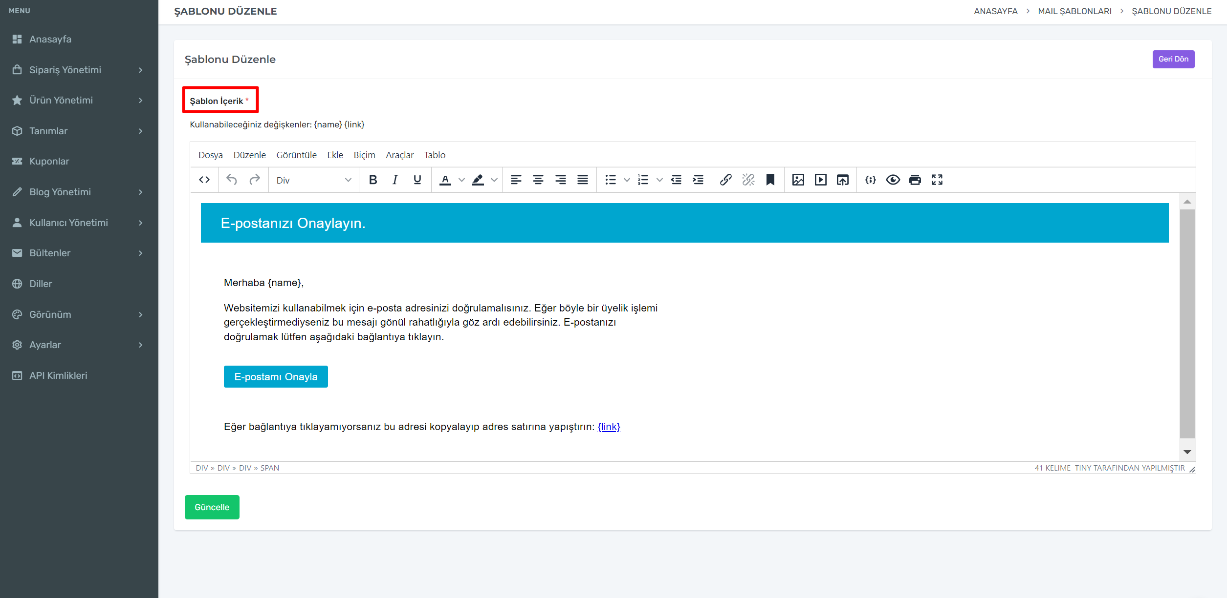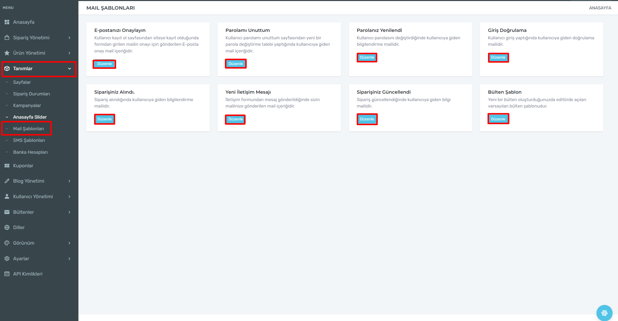 Mail şablonları kısmından kırmızı kutucuk içerisinde yazan düzenle kısmına tıklayarak içeriğinde düzenlemeler yapabilirsiniz.