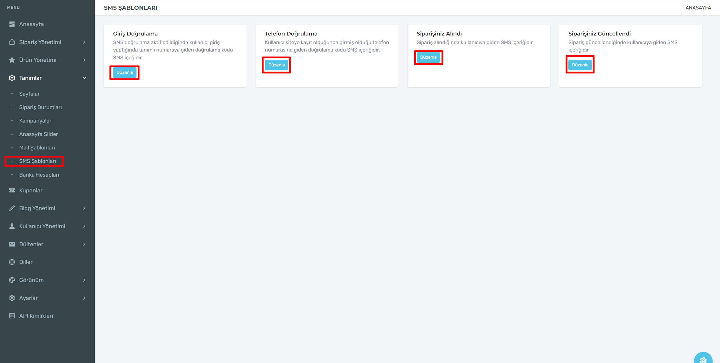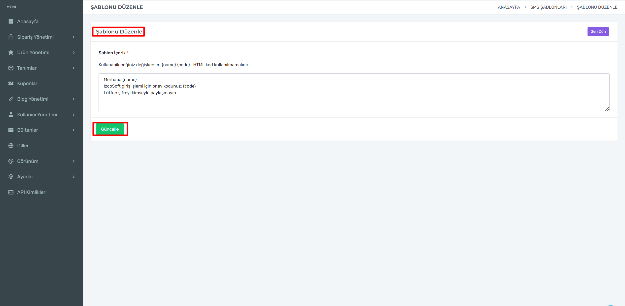 SMS Şablonlarının altında yer alan mavi kutucuk içerisinde yazan düzenleye tıklayarak şablon üzerinde düzenlemelerinizi gerçekleştirebilir.